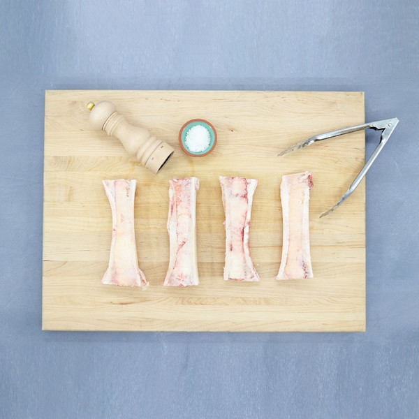 The simplest way to serve marrow bones is to season them with salt and pepper, broil until the marrow begins to soften but not melt and serve them with crostini or toast points for spreading. For an extra layer of flavor, spoon on a topping of breadcrumbs seasoned with olive oil, fresh parsley, garlic, salt, and chili flakes before popping under the broiler. Serve broiled marrow bones alongside a steak or slice of prime rib, or on their own with crostini or toast points and some condiments such as shallot marmalade, fried capers, or whole grain mustard aioli.
